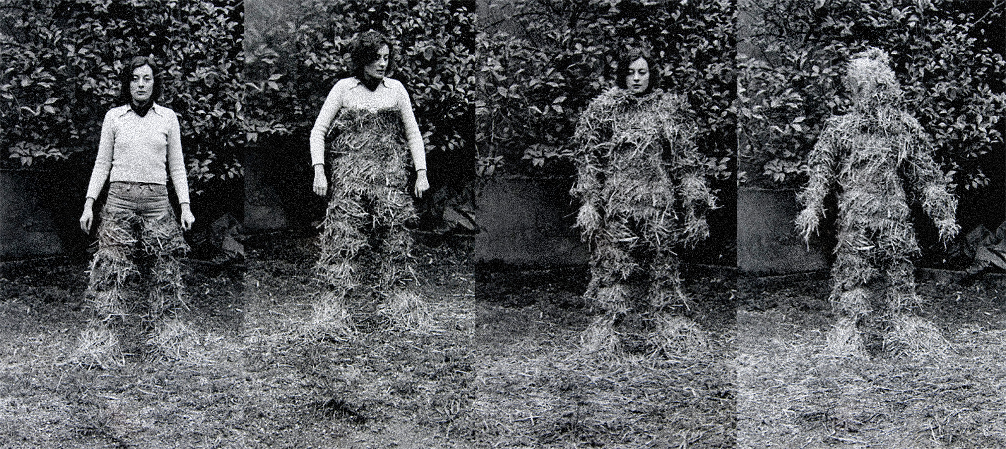 Relación del cuerpo con elementos naturales. El cuerpo cubierto de paja [Documentación de la acción realizada en enero de 1975 en Sabadell, España], 1975.